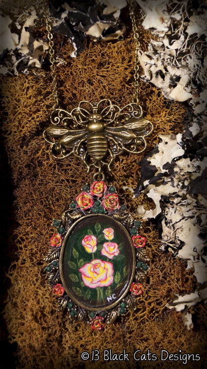 Hand-painted with high quality acrylic paints on canvas paper and set into an antique bronze setting. You are sure to love this little piece of wearable art.